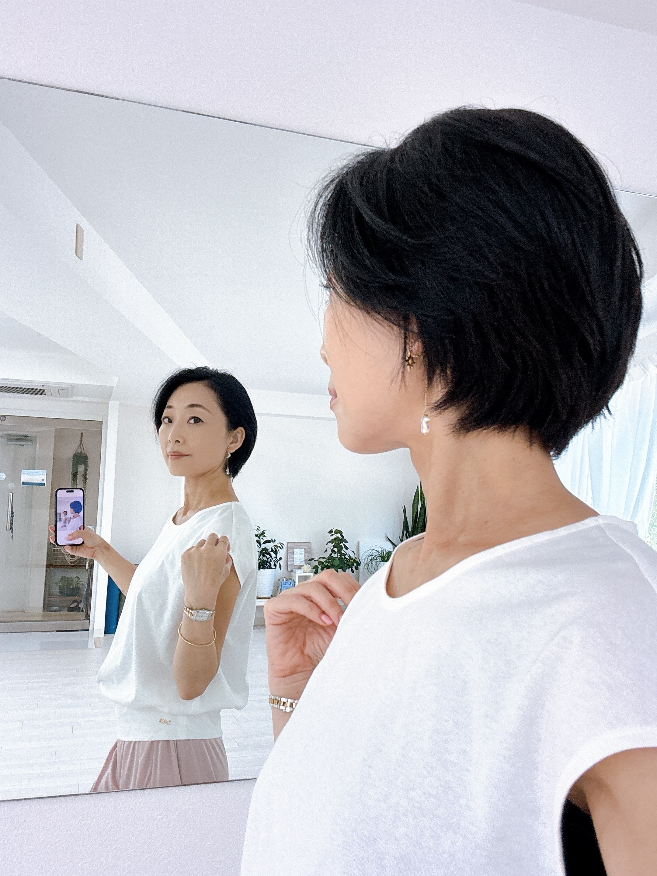 ダウンドッグなど逆転のポーズでもすそがまくれ上がりにくく、えり元が顔を覆うことなく快適です。